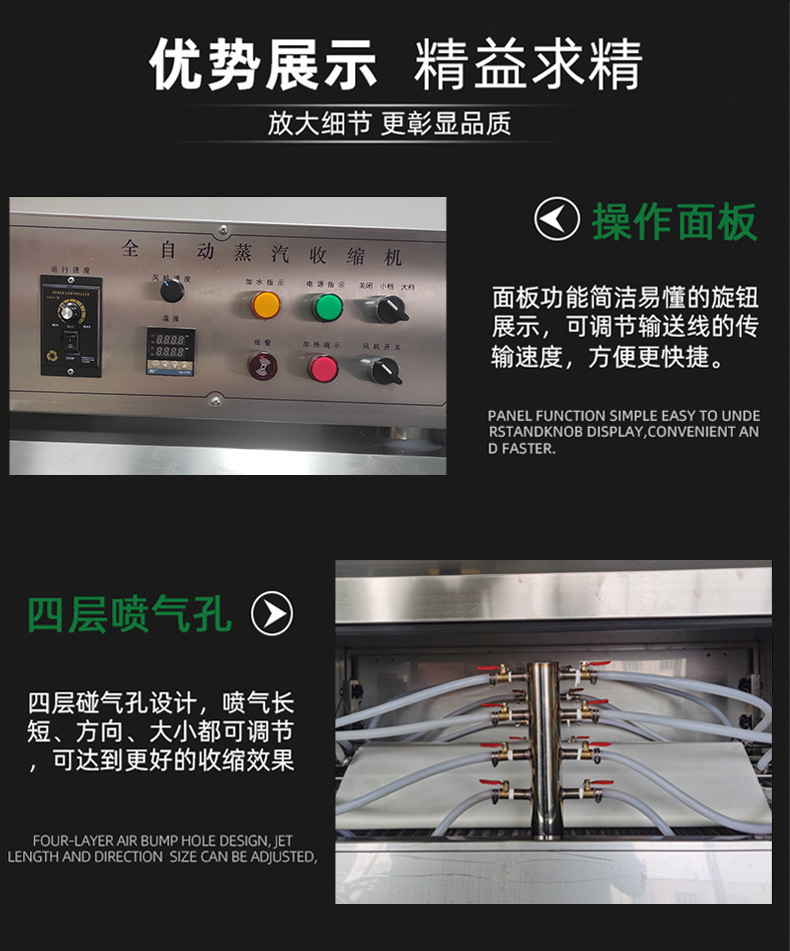 隔熱與保溫性能好:整機(jī)一般采用三層隔熱設(shè)計(jì),減少熱量散失,不僅提高了能源利用效率,降低了能耗成本,還能保持收縮通道內(nèi)的溫度穩(wěn)定,有利于包裝膜的收縮;同時(shí),采用防水設(shè)計(jì)和不銹鋼 304 制造,延長了設(shè)備的使用壽命.