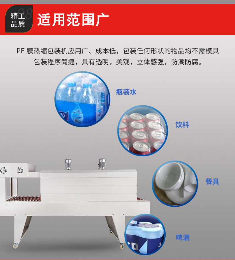 - 良好的集成性:可以很容易地與其他包裝設(shè)備或生產(chǎn)線集成,實現(xiàn)自動化包裝流程。例如,它可以與產(chǎn)品自動進料設(shè)備、貼標設(shè)備等配合使用,構(gòu)建完整的包裝生產(chǎn)線,提高生產(chǎn)效率和包裝質(zhì)量的一致性。這種集成性使得 PE 熱收縮包裝機在現(xiàn)代化的工業(yè)生產(chǎn)中發(fā)揮著重要的作用。