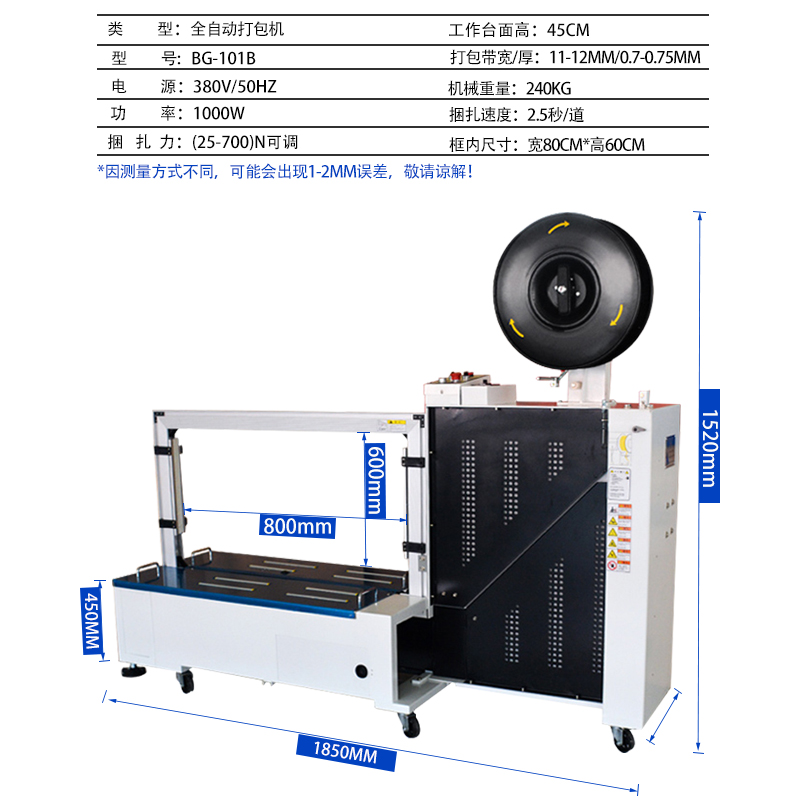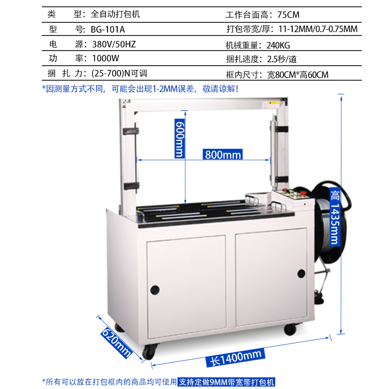 - 尺寸與形狀:如果物品尺寸較大、形狀不規(guī)則,需要選擇弓架尺寸大的打包機(jī),如家電、家具等行業(yè),可能需要弓架寬度 800mm 以上、高度 600mm 以上的機(jī)型;對(duì)于小型物品,如快遞包裹、小型電子產(chǎn)品等,可選弓架尺寸較小的,如寬度 400-600mm、高度 300-400mm 的機(jī)型,方便精準(zhǔn)打包且設(shè)備占地小。