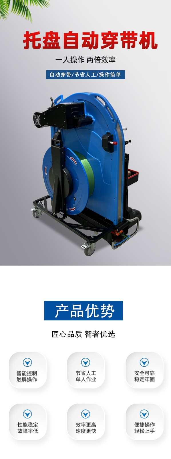 自動托盤穿帶打包機是物流、制造等行業中實現托盤貨物自動化捆扎的核心設備,通過機械結構與智能控制的協同,將貨物與托盤牢固綁定,提升運輸穩定性與作業效率。以下從核心功能、技術優勢、選型要點及維護建議四個維度,進行全面梳理: