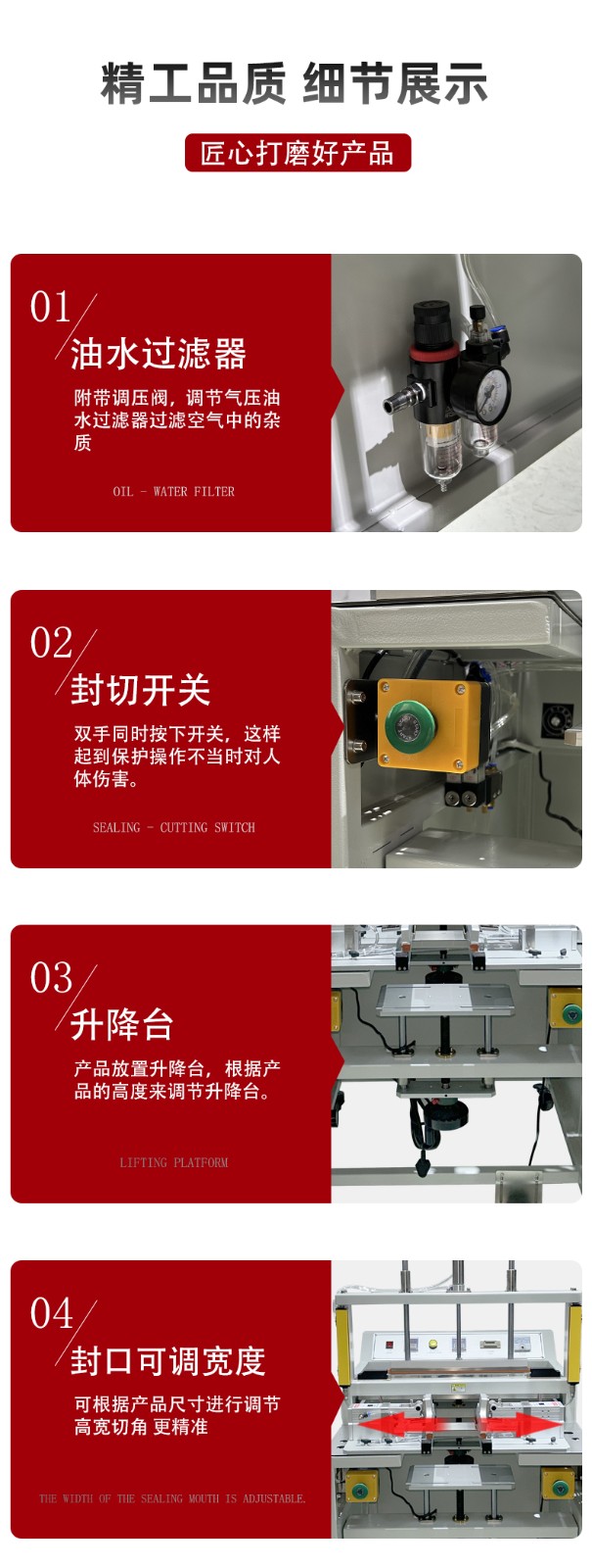 高效快捷:封口速度比傳統(tǒng)設(shè)備快,部分機型每分鐘可完成 50 次精準(zhǔn)封口,能有效提高生產(chǎn)效率。 操作簡便:通常采用一鍵啟動或腳踏開關(guān)控制,操作人員只需簡單培訓(xùn)即可上手操作。 封口質(zhì)量好:采用雙面加熱封口,壓合平整美觀,封口牢固,且封口長度、寬度等參數(shù)可根據(jù)需求調(diào)整。 適應(yīng)性強:可適用于 PVC、PP、POF 等多種材質(zhì)的收縮膜,還能根據(jù)不同產(chǎn)品規(guī)格進行調(diào)整,兼容多種尺寸的包裝材料。 安全性高:部分機型配備急停按鈕等安全裝置,且外觀設(shè)計圓潤,無棱角,可減少操作人員受傷的風(fēng)險。 應(yīng)用場景 廣泛應(yīng)用于食品、化工、電子、醫(yī)藥、日化等行業(yè),可用于對各種產(chǎn)品的包裝材料進行封口和切角處理,如食品包裝袋、日化用品包裝袋、電子產(chǎn)品包裝盒等的封裝。 代表產(chǎn)品 如中堡智能科技實業(yè)有限公司的HX-4018 智能氣動封口切角機、東莞博冠包裝實業(yè)有限公司的氣動封口切角機等,均具有運行穩(wěn)定、包裝速度快、多規(guī)格適配等特點。