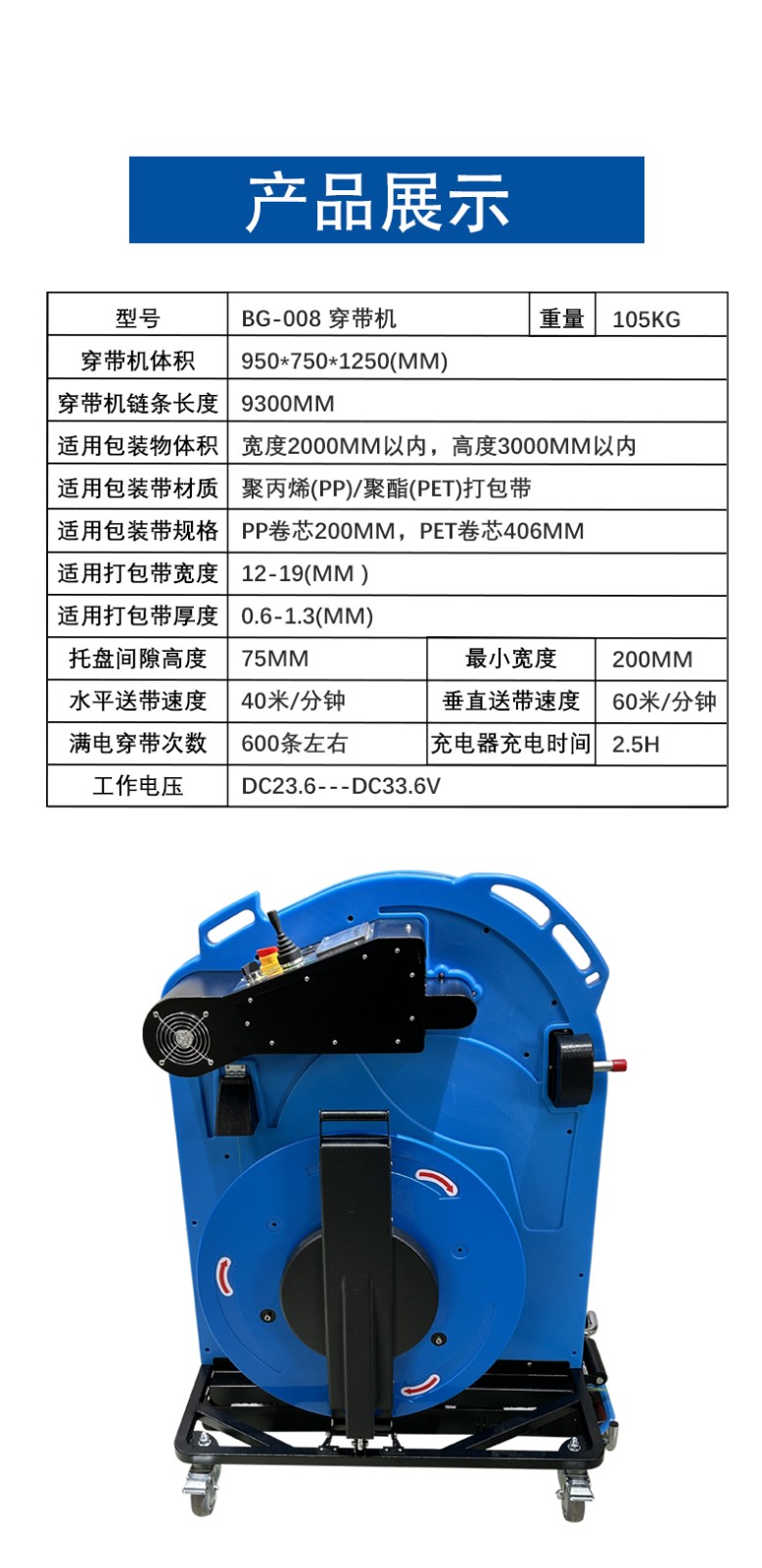 - 穿帶機是一種在包裝流程中起輔助作用的設(shè)備,主要用于將打包帶穿過被包裝物品周圍或包裝結(jié)構(gòu)中的特定位置,以便后續(xù)進行打包操作。它可以被看作是包裝自動化生產(chǎn)線中的一個環(huán)節(jié),能夠有效提高打包的效率和準確性。