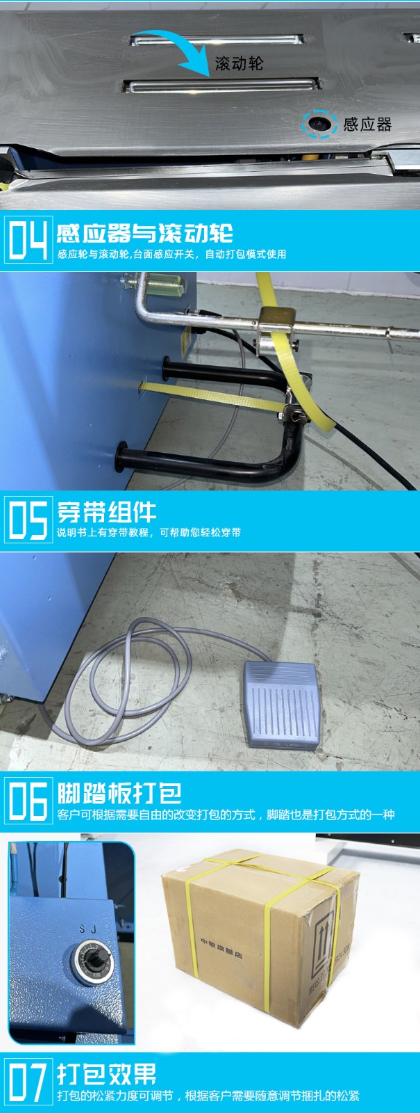- 自動(dòng)上帶:機(jī)器啟動(dòng)后,會(huì)自動(dòng)從打包帶卷中抽出打包帶,并將其傳送到預(yù)定的位置,準(zhǔn)備進(jìn)行打包。這個(gè)過程無需人工干預(yù),大大提高了工作效率。