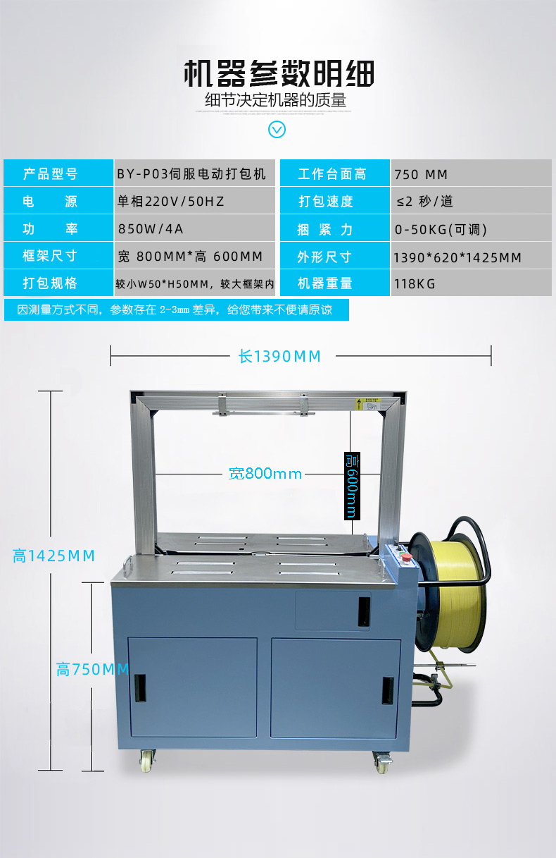 - 全自動(dòng)伺服打包機(jī)通常具有簡(jiǎn)潔、緊湊的外觀設(shè)計(jì),整體結(jié)構(gòu)堅(jiān)固耐用。其機(jī)身主要由框架、工作臺(tái)、輸送帶、控制箱等部分組成。框架一般采用優(yōu)質(zhì)金屬材料制成,經(jīng)過精細(xì)加工和表面處理,具有良好的穩(wěn)定性和耐腐蝕性。工作臺(tái)位于機(jī)器的中央位置,是放置待打包物品的區(qū)域,表面平整光滑,便于物品的放置和移動(dòng)。輸送帶貫穿整個(gè)機(jī)器,用于輸送物品進(jìn)出打包區(qū)域,其寬度和長(zhǎng)度根據(jù)不同的機(jī)型有所差異,以適應(yīng)各種尺寸的物品打包。控制箱通常安裝在機(jī)器的一側(cè),集成了操作面板和控制系統(tǒng),方便操作人員進(jìn)行參數(shù)設(shè)置和對(duì)機(jī)器的運(yùn)行進(jìn)行監(jiān)控。
