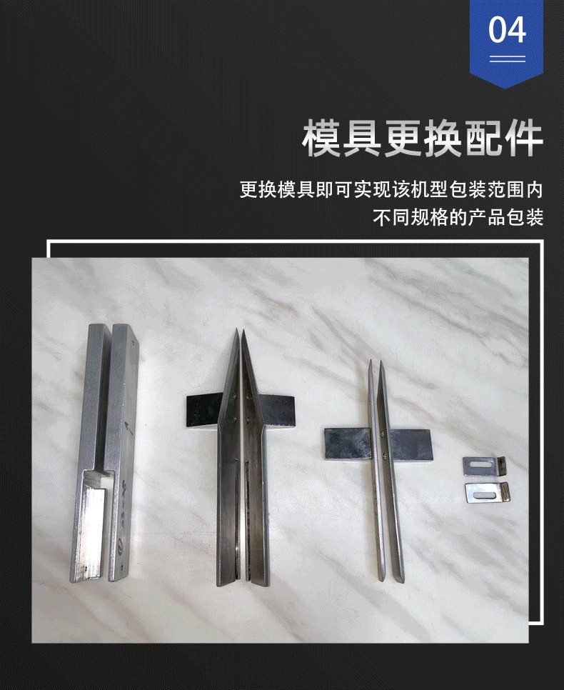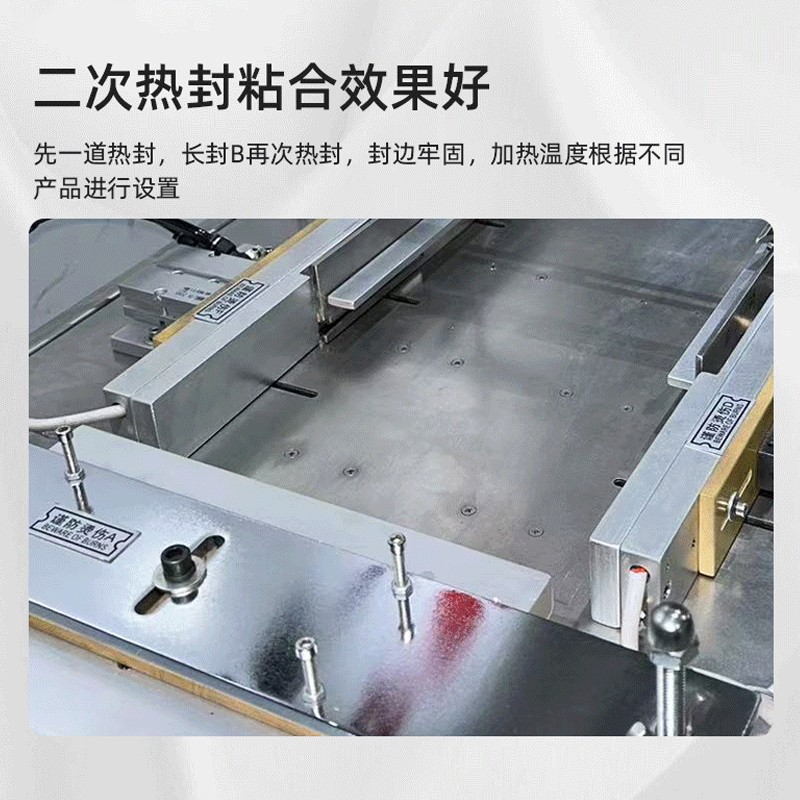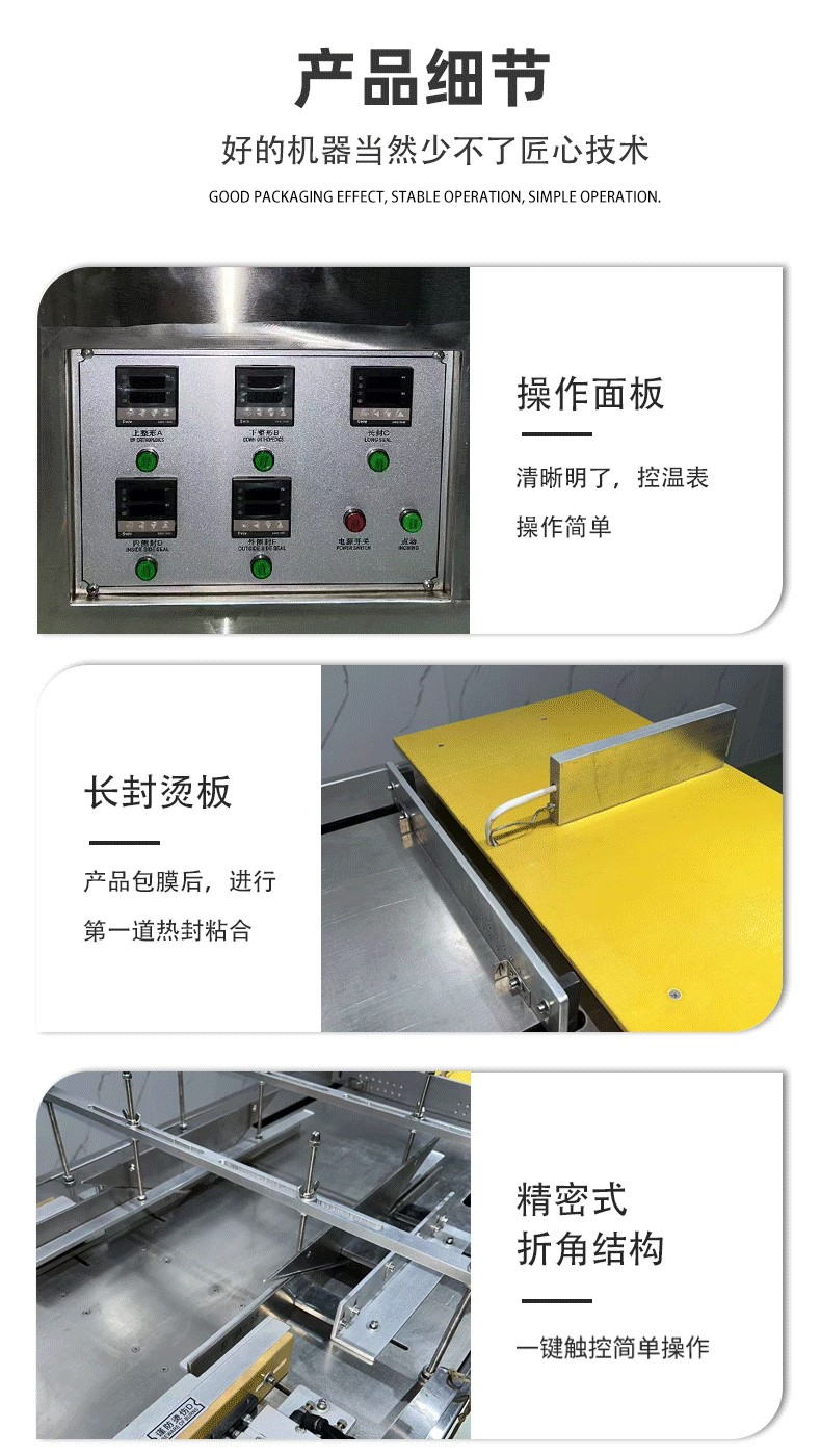 - 折邊定型:封切后的產品進入折邊工位,預熱裝置先對產品兩端的多余膜料進行軟化(便于塑形),再通過機械折邊機構(側折板、端折板)將膜料折疊、壓合,使包裝邊緣平整緊致,最終形成與產品形狀完全匹配的立體包裝;